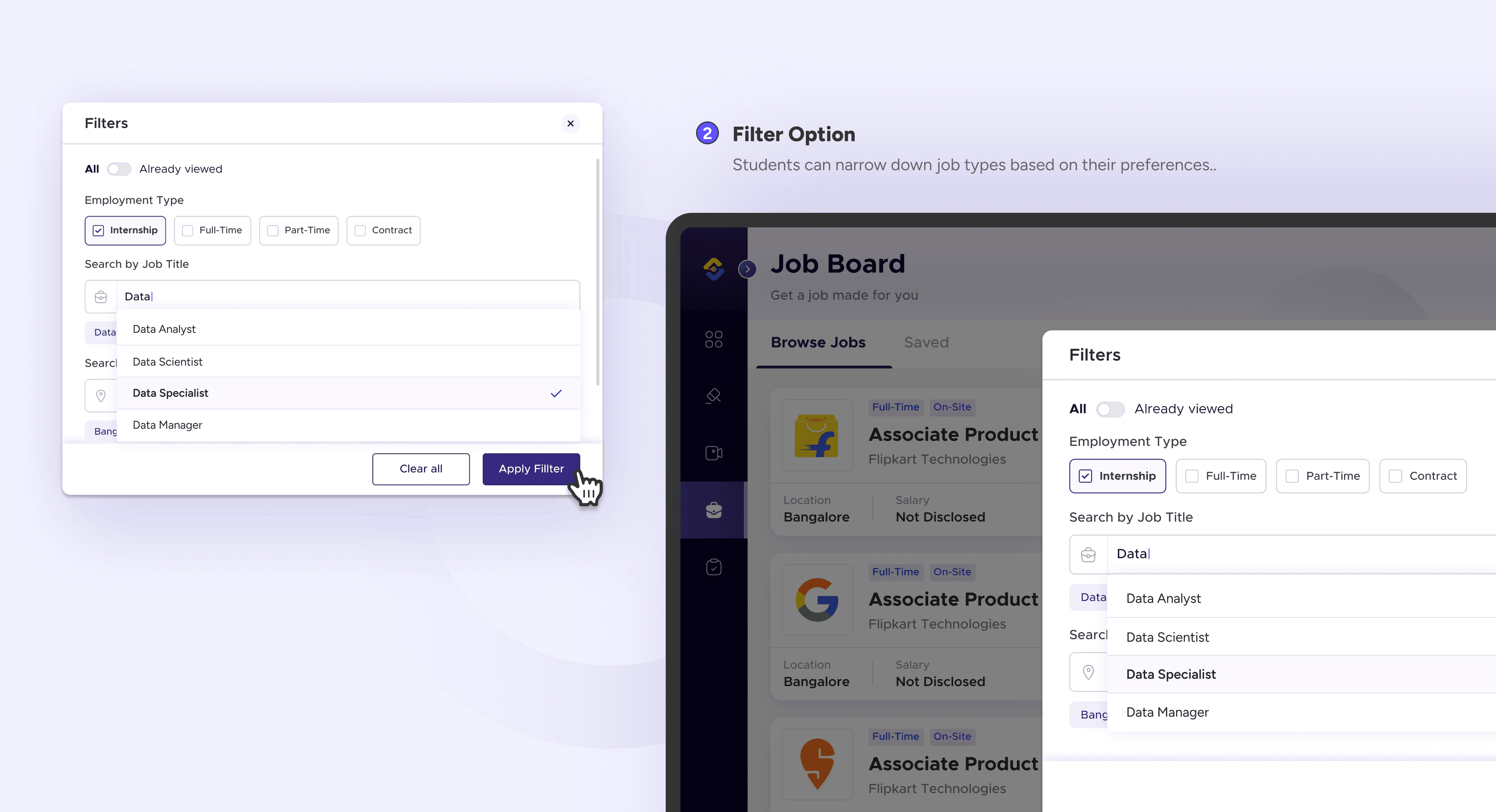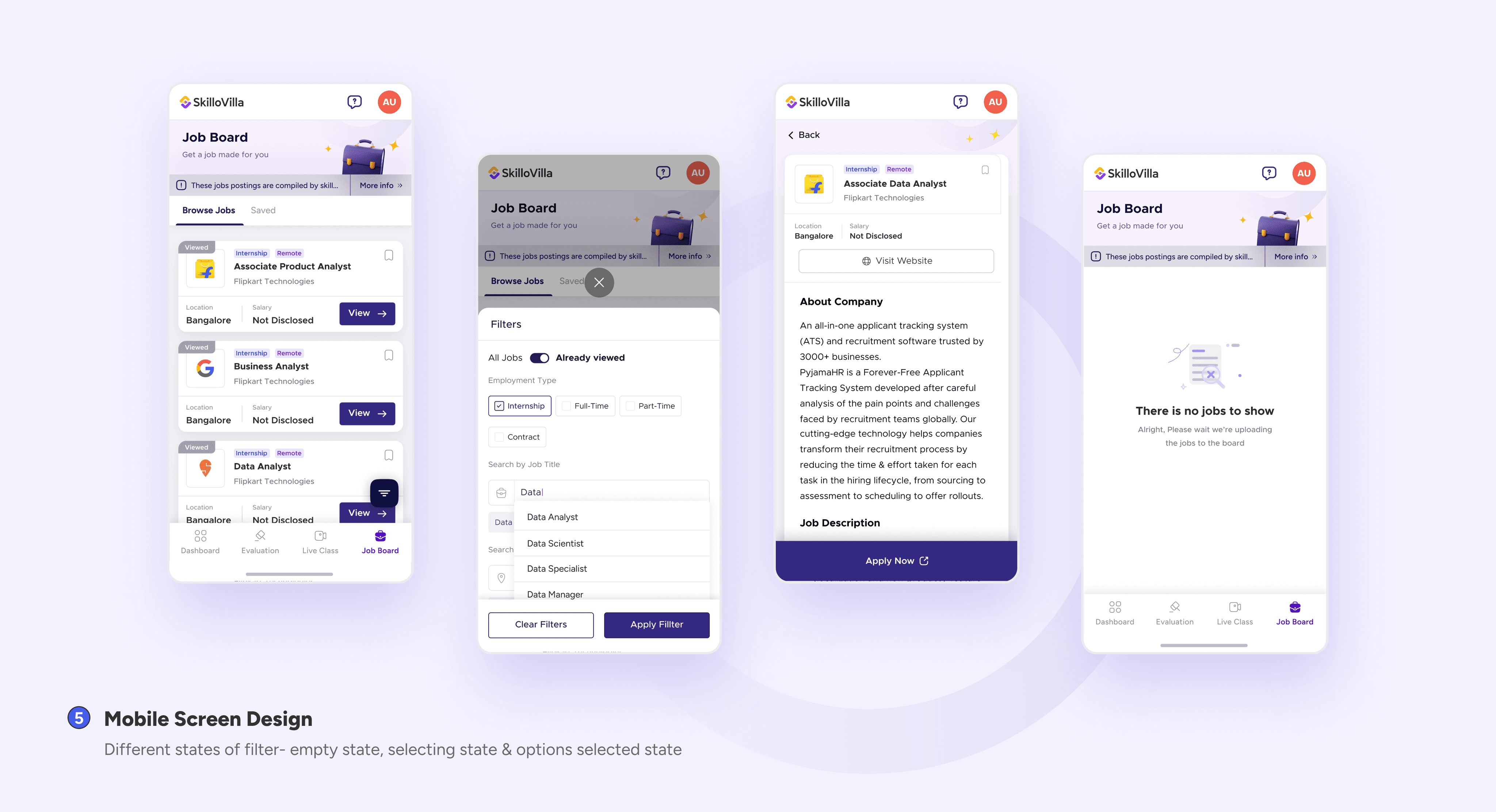 As part of enhancing the post-learning experience, I designed a job portal aimed at helping students explore relevant job opportunities after completing their courses. Our objective was to create an intuitive and user-friendly interface that connects upskilling with job placement, enhancing the overall career-building journey for users.