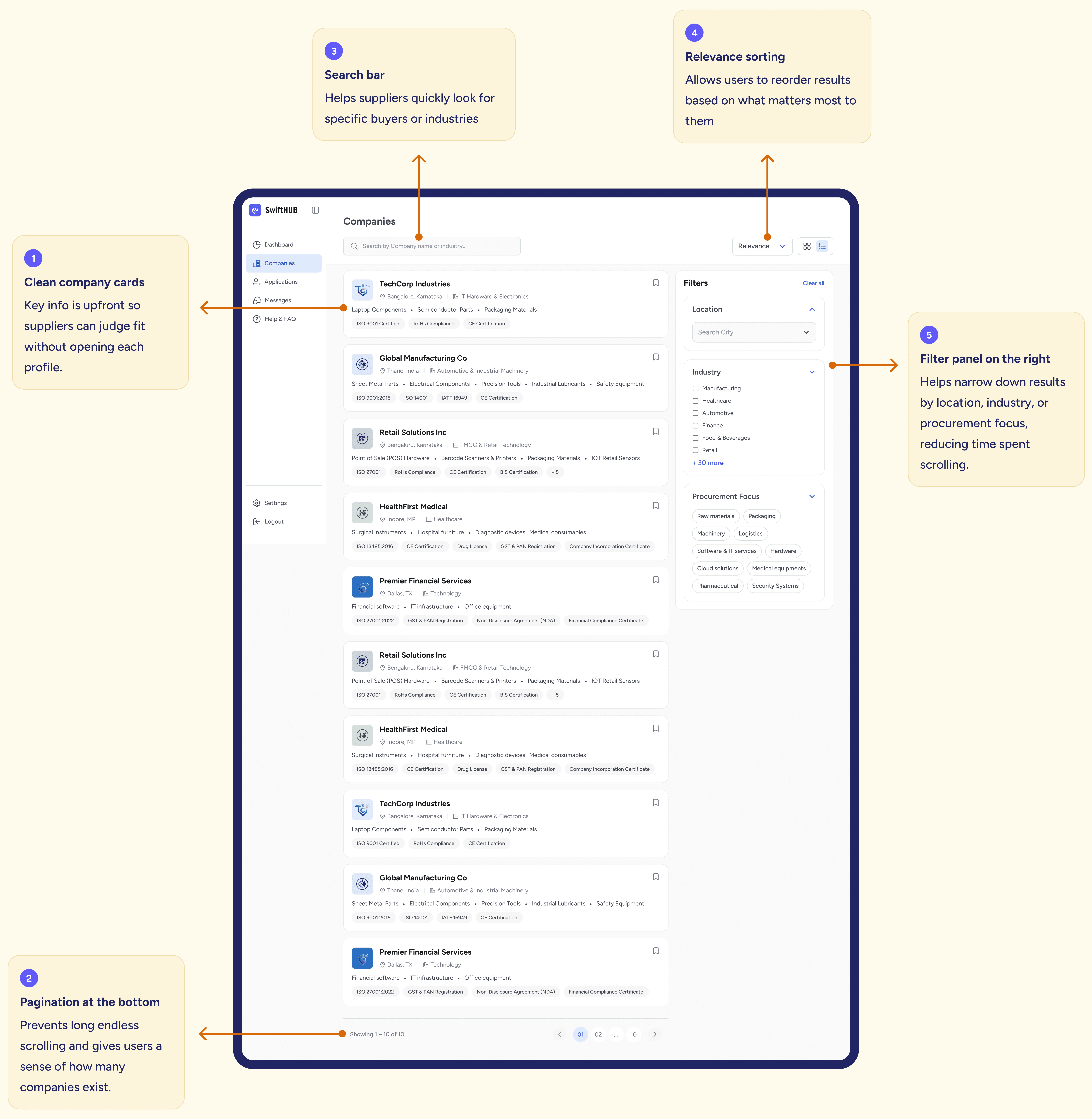 This page makes it easy for suppliers to browse buyers, filter by what matters, and quickly understand which companies are a good fit.
