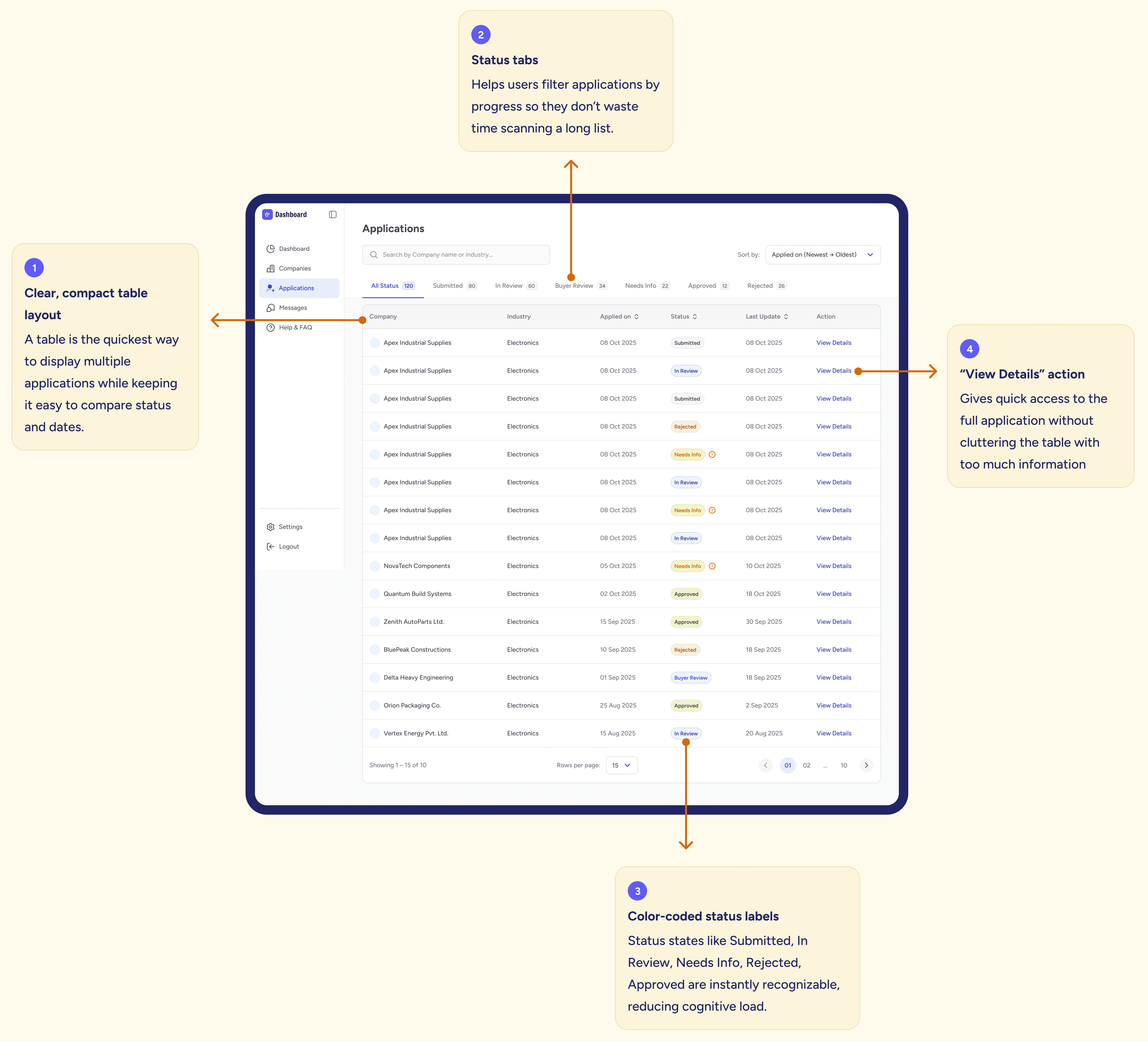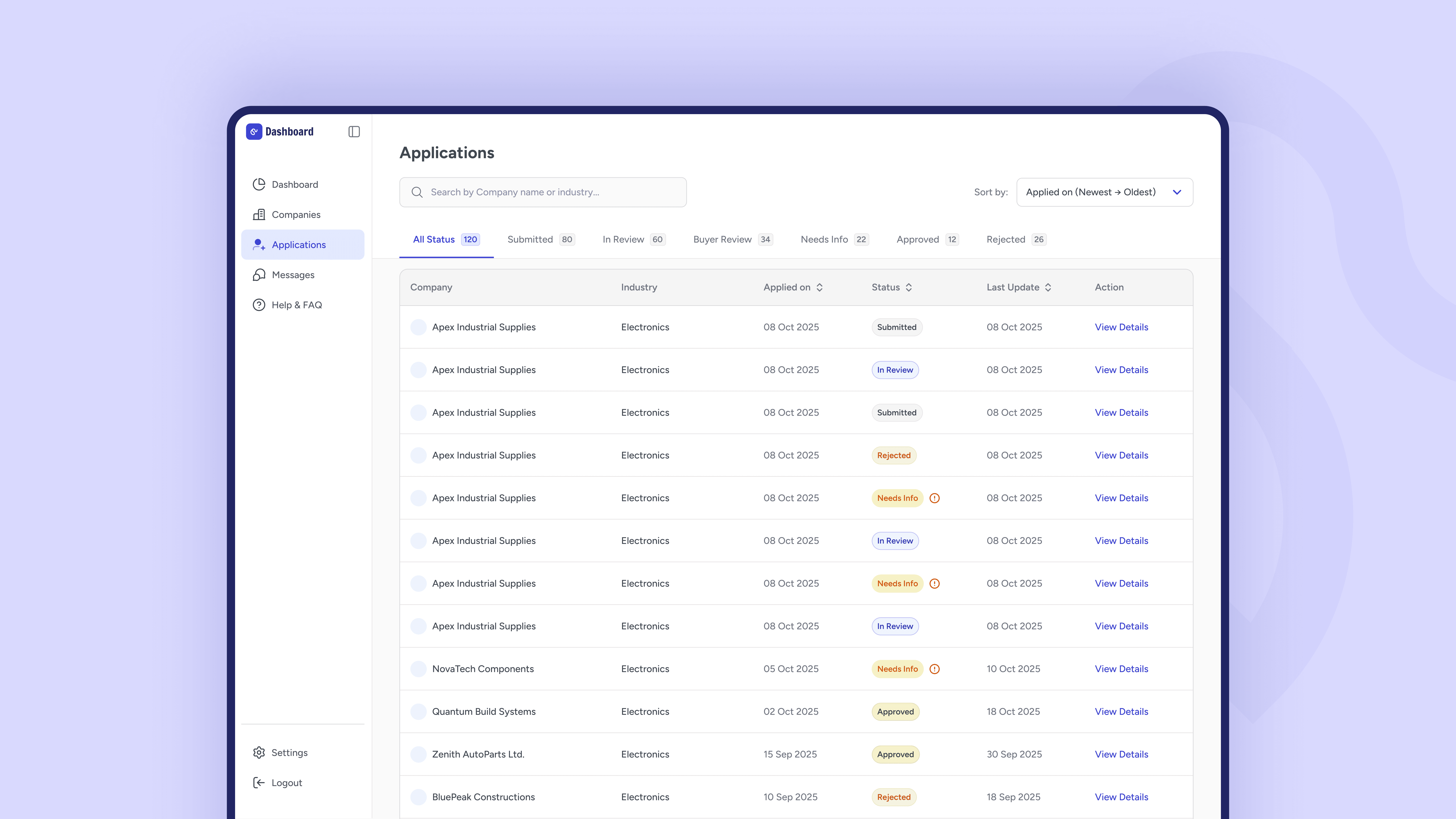 This page gives suppliers a quick overview of all their applications and makes it easy to track progress, check updates, and open any application when needed.
