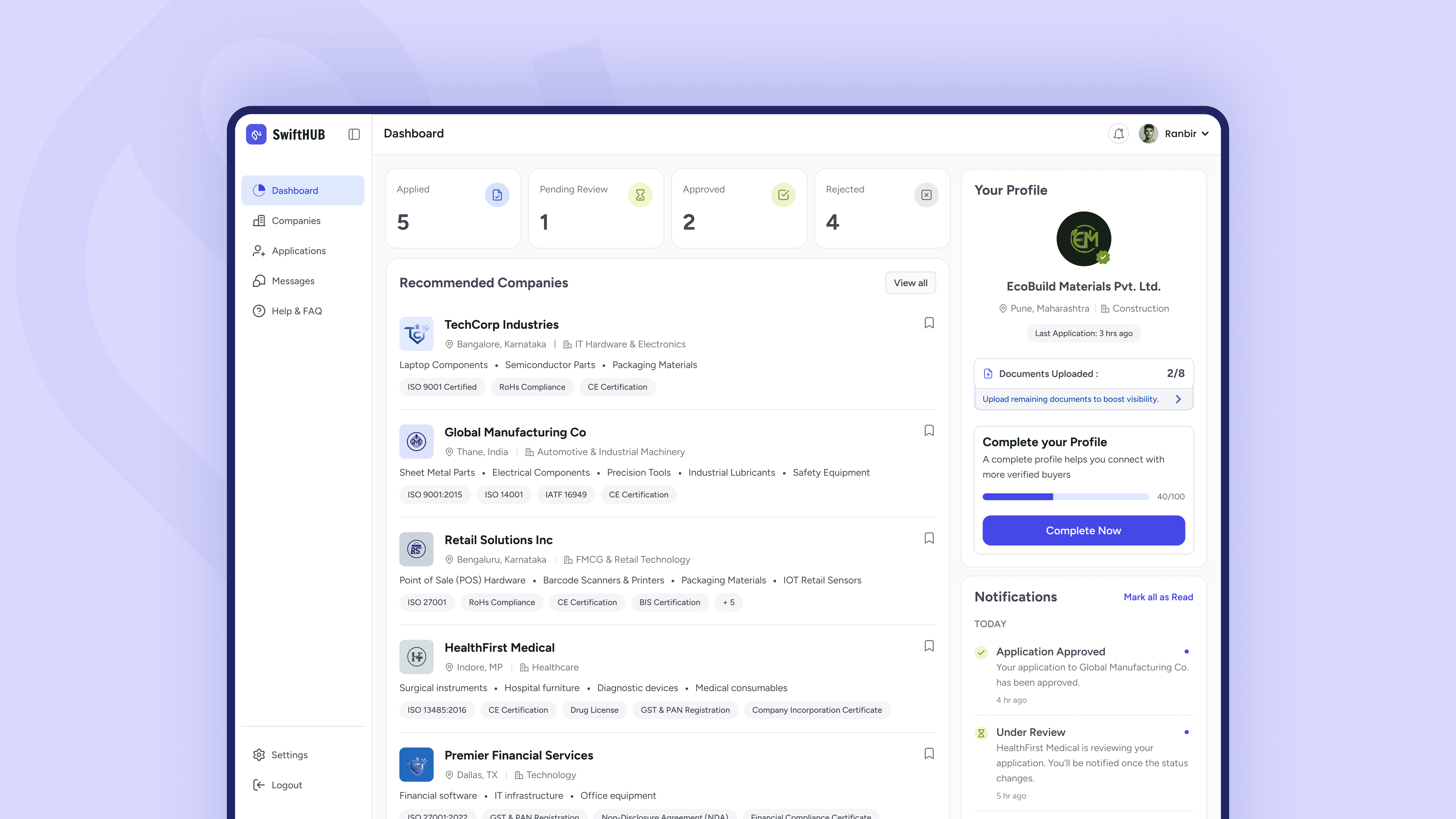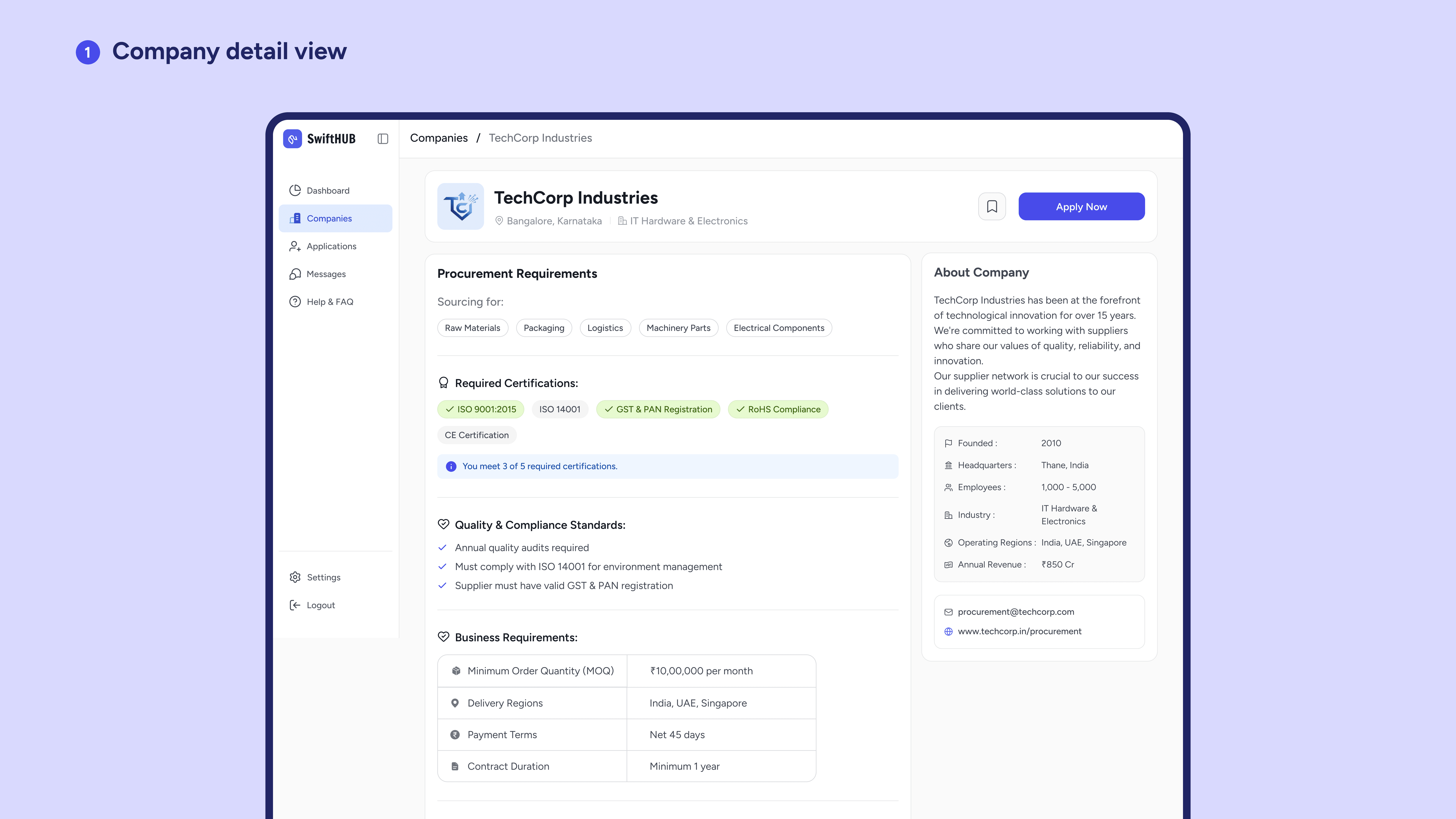 SwiftHub Connect is a platform that helps suppliers create their business profile and apply to work with different companies in one place.