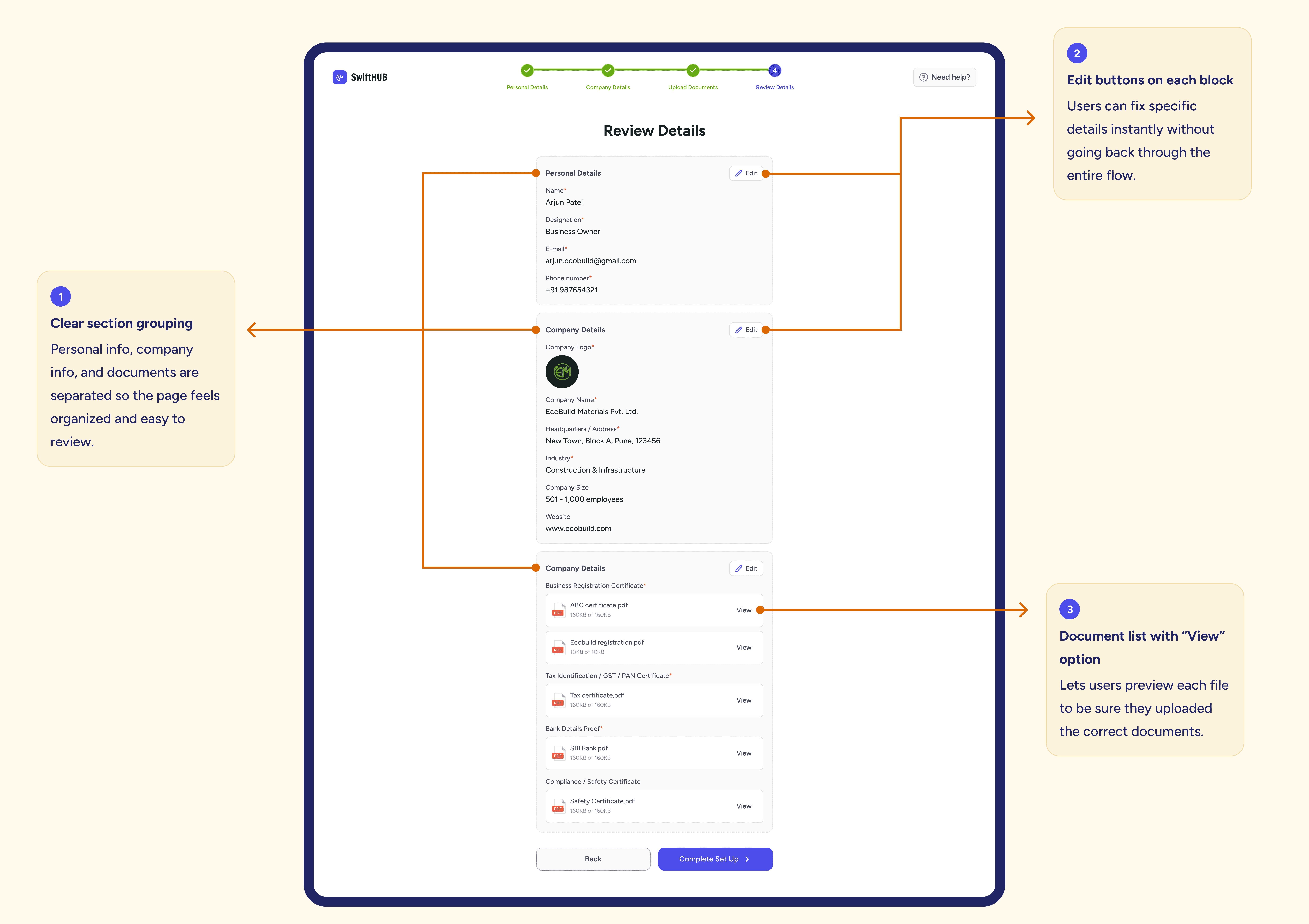 This screen gives users a clean summary of everything they’ve added so they can check details quickly and fix anything before completing the setup.