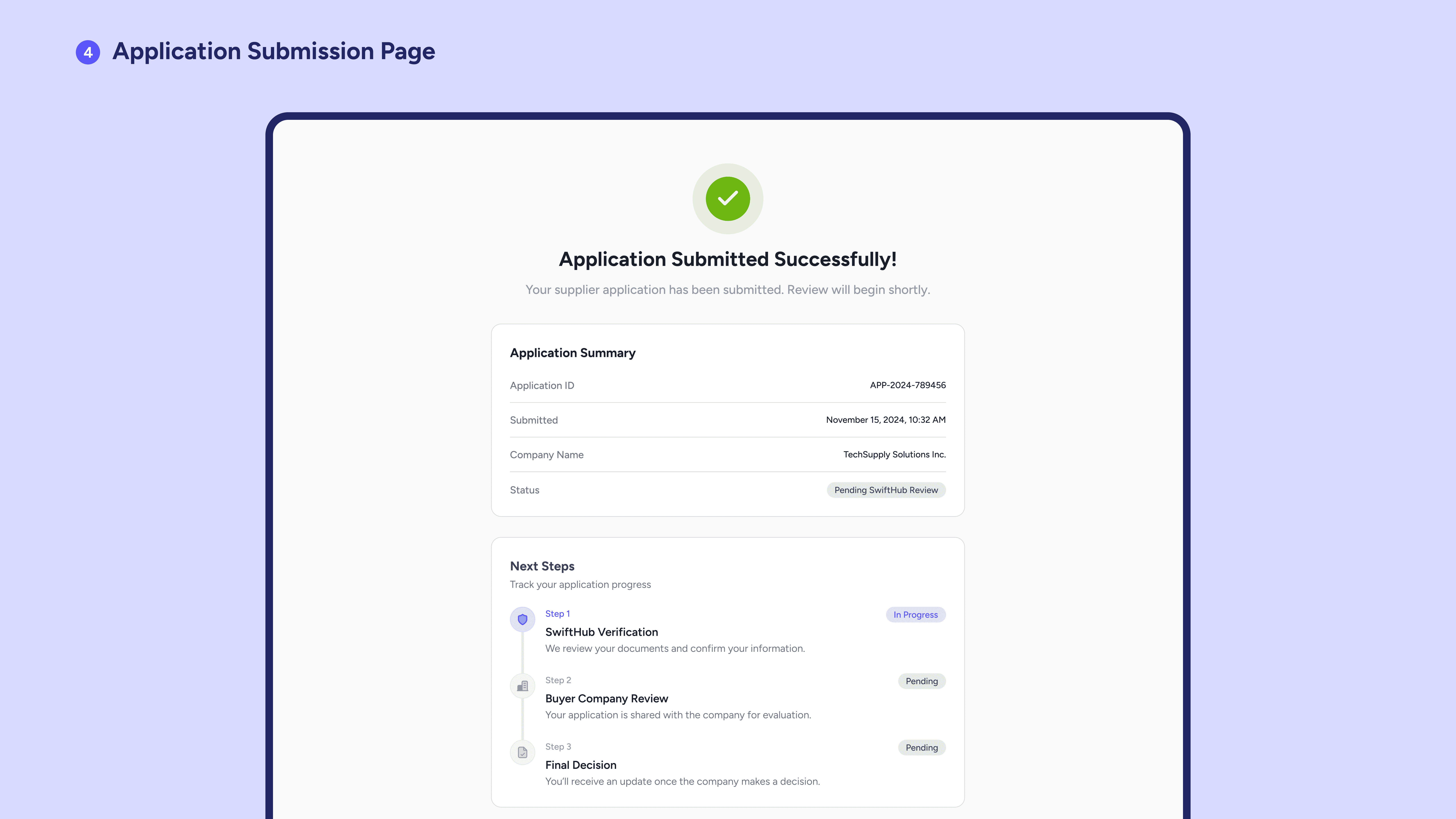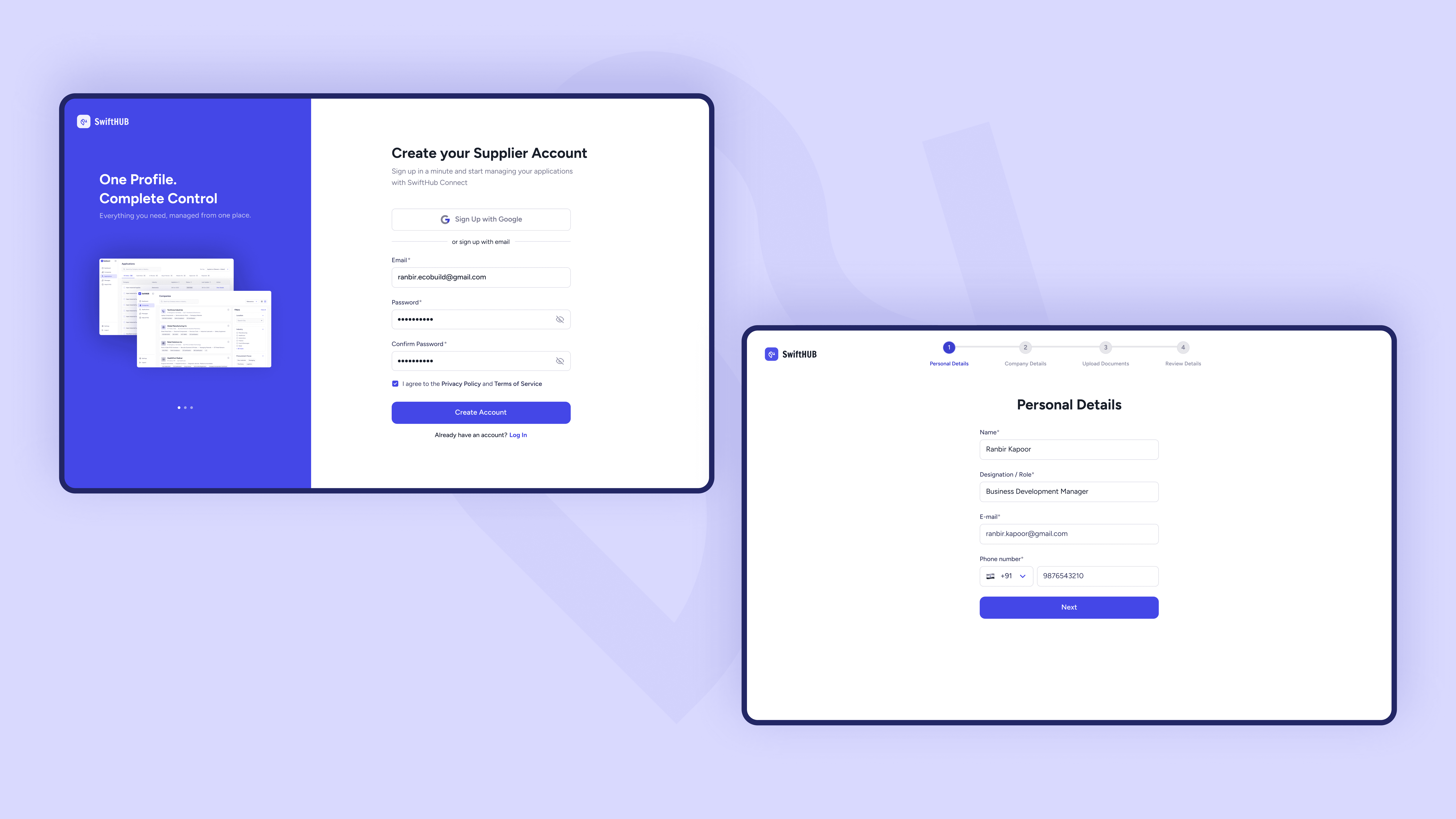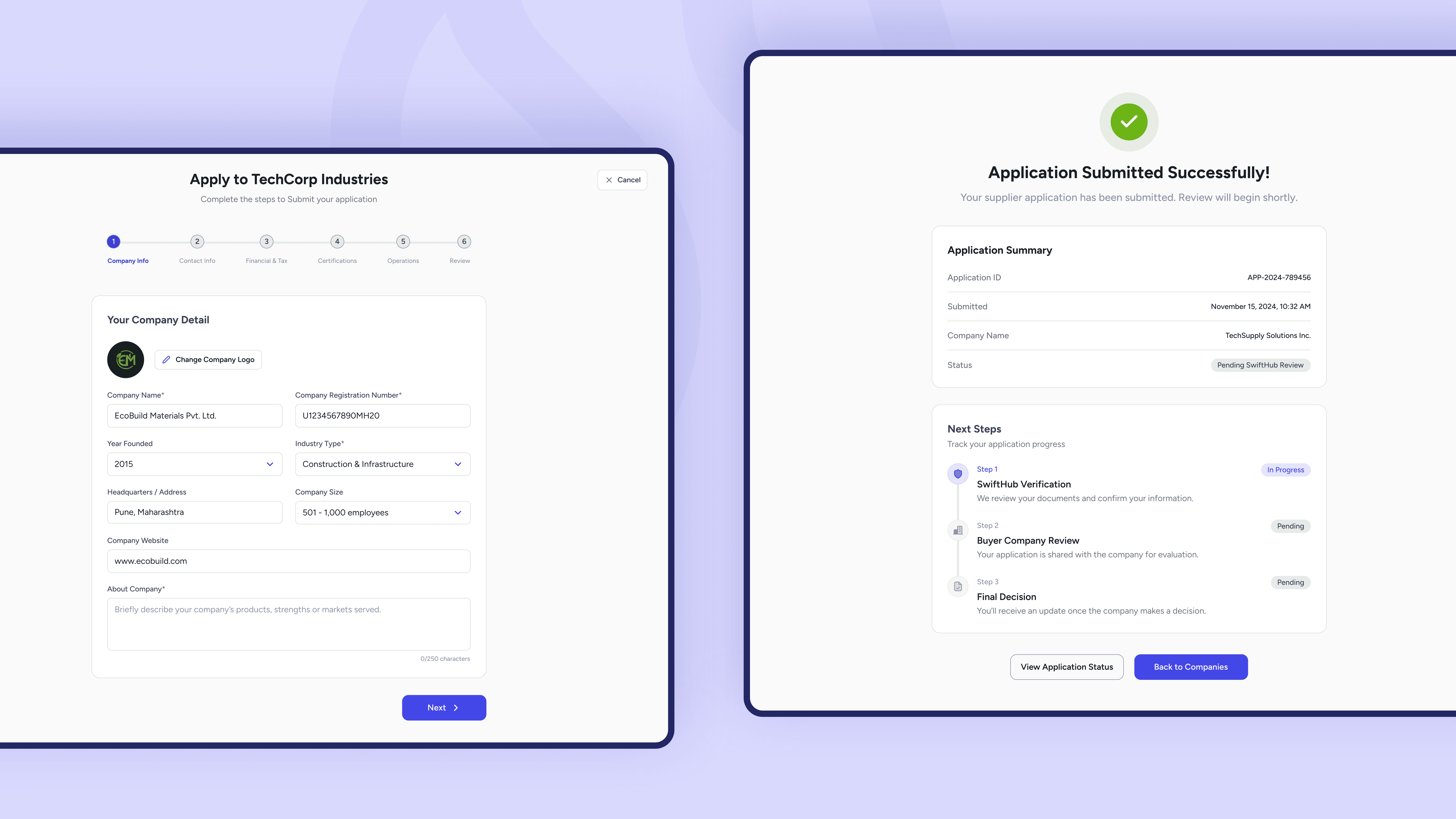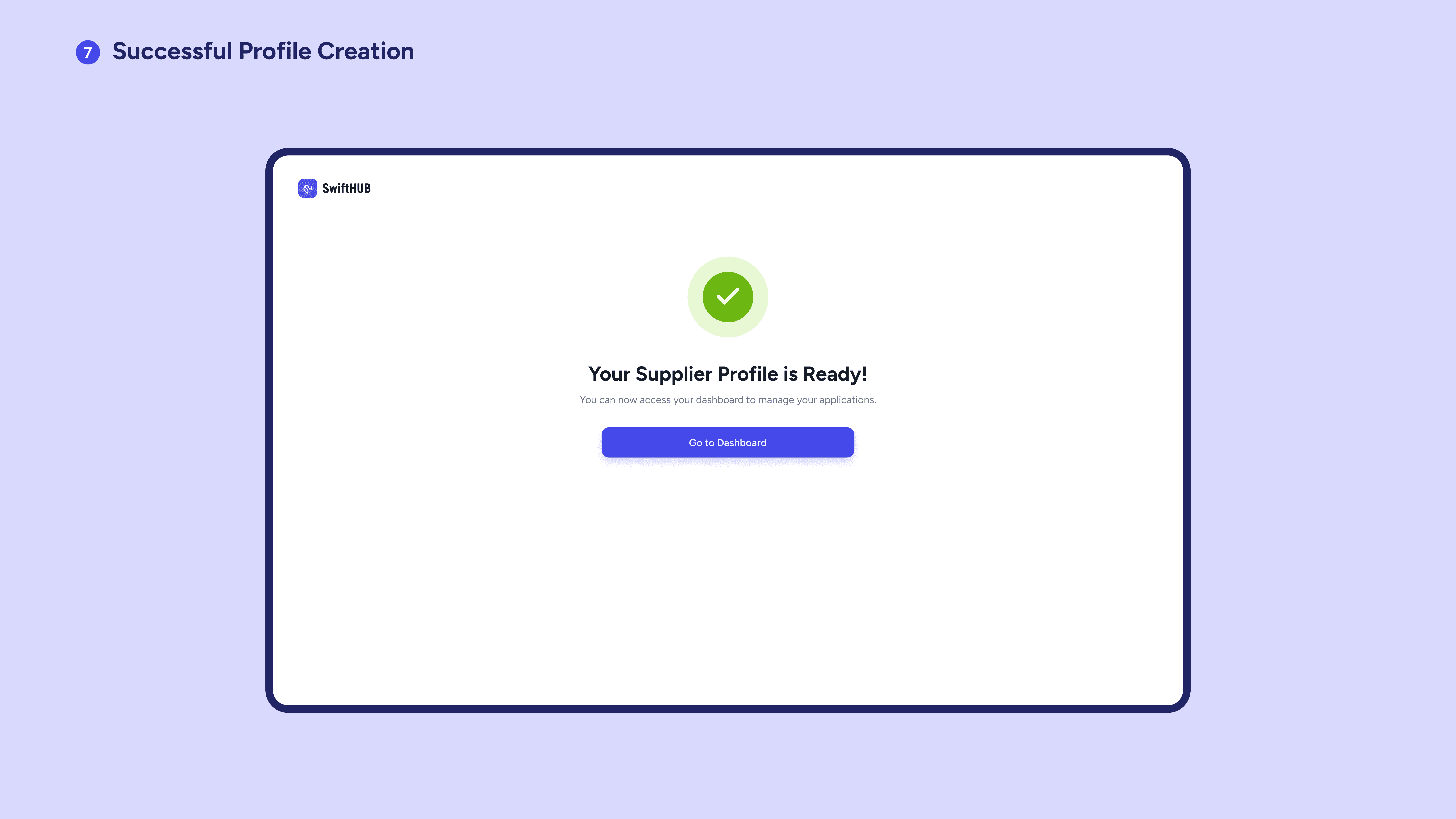 This project focuses on designing a clear and simple flow that helps suppliers create their business profile and submit their application through SwiftHub Connect.