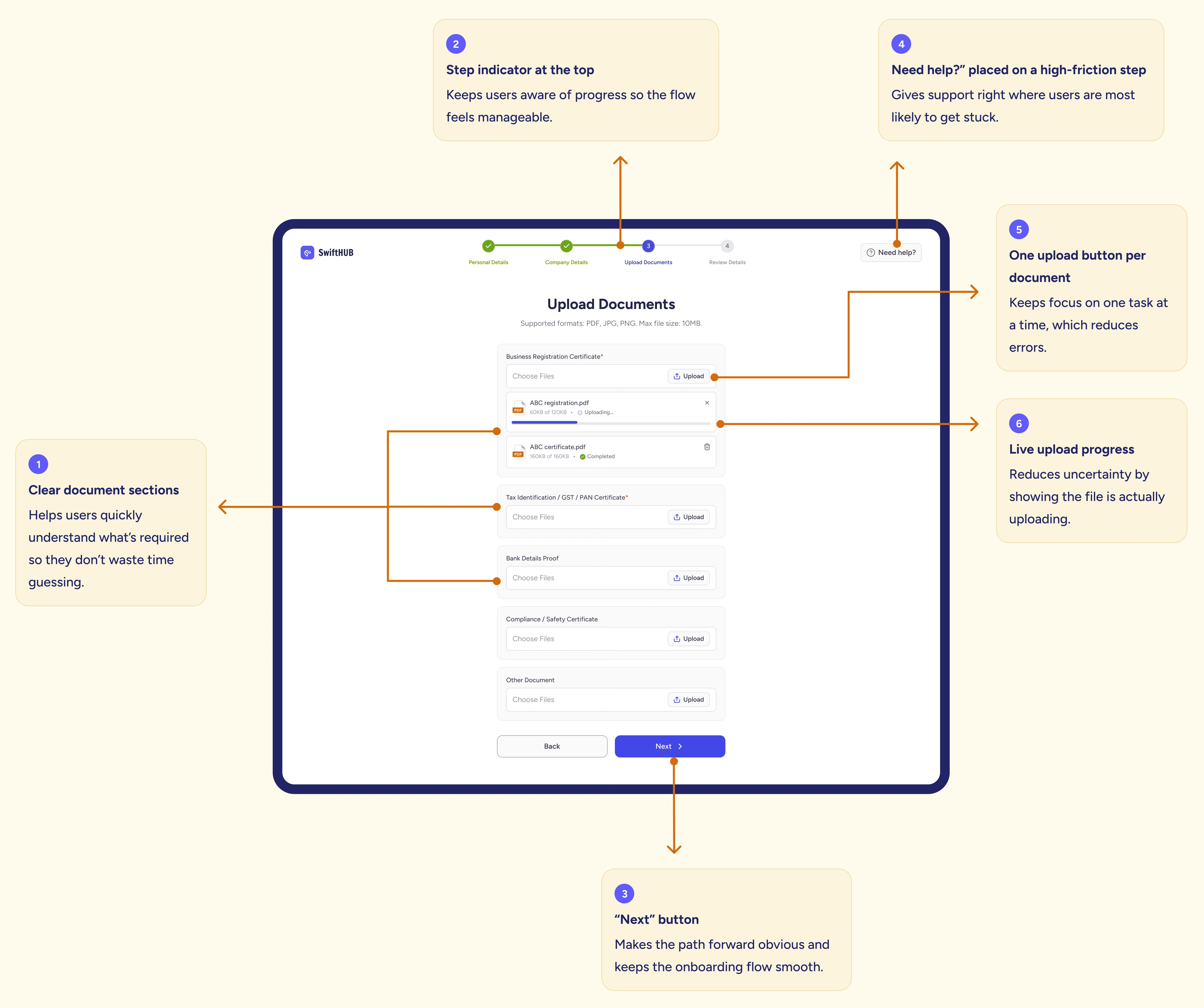 Step-Based Onboarding : Breaking the flow into small, guided steps reduces confusion and significantly lowers drop-offs.