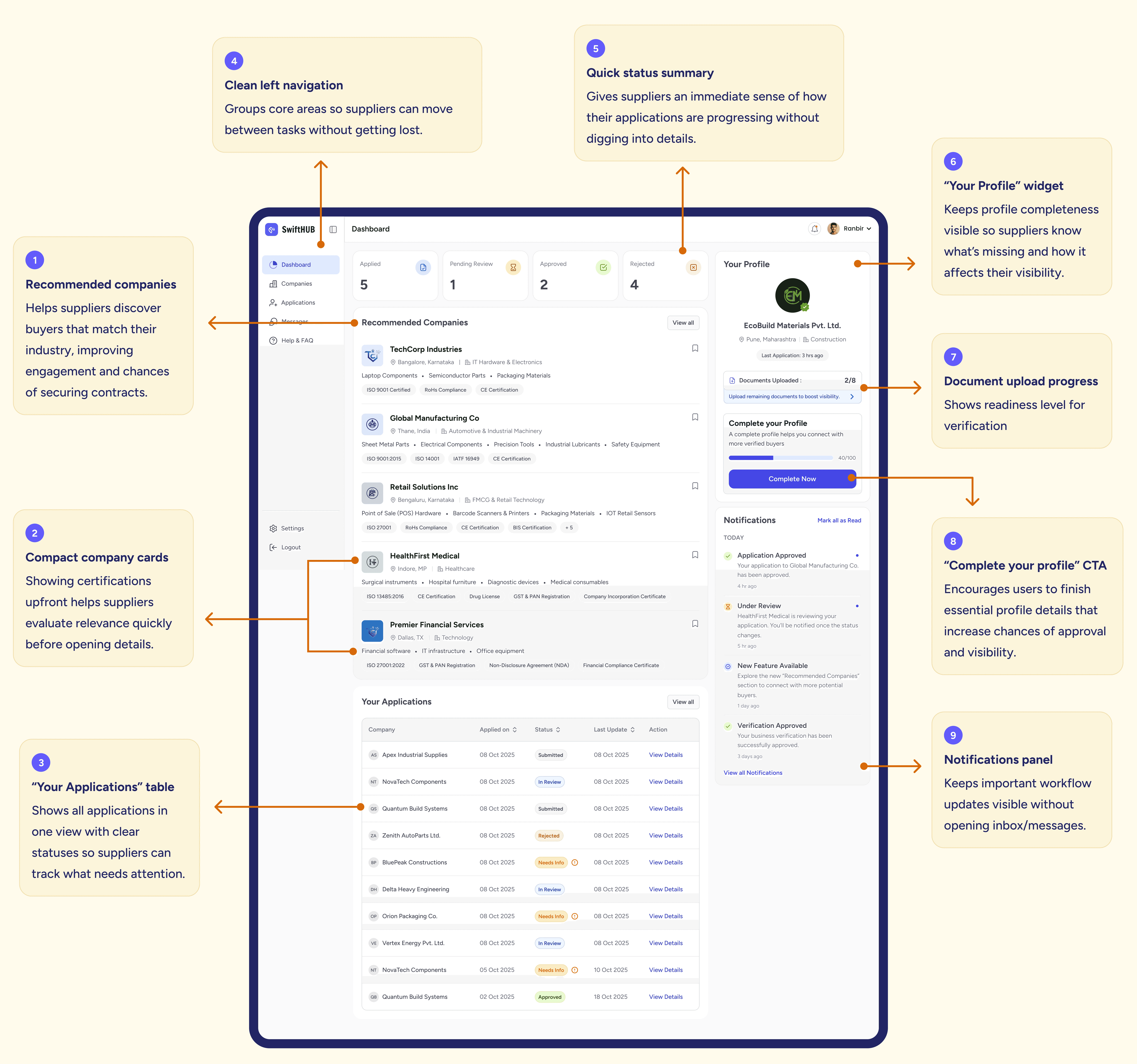 Instead of managing everything manually, suppliers can build their profile once, share it with buyers, and track all their applications from a single dashboard.