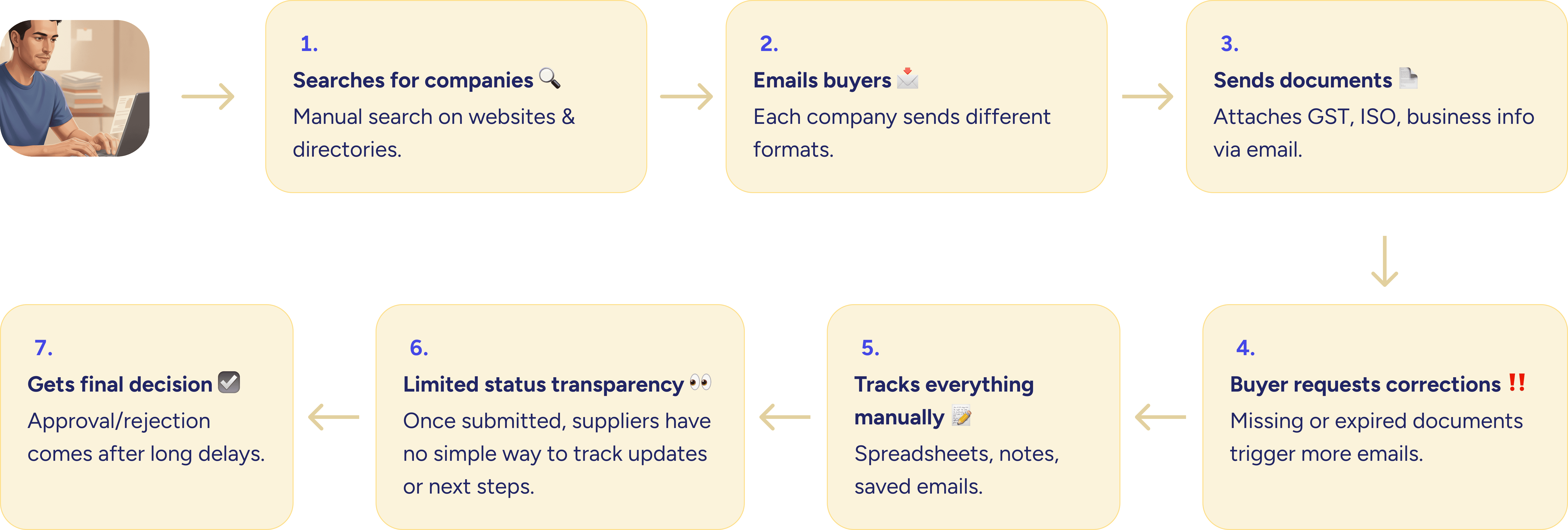 Today, becoming a supplier for large companies is still slow, manual, and disconnected.